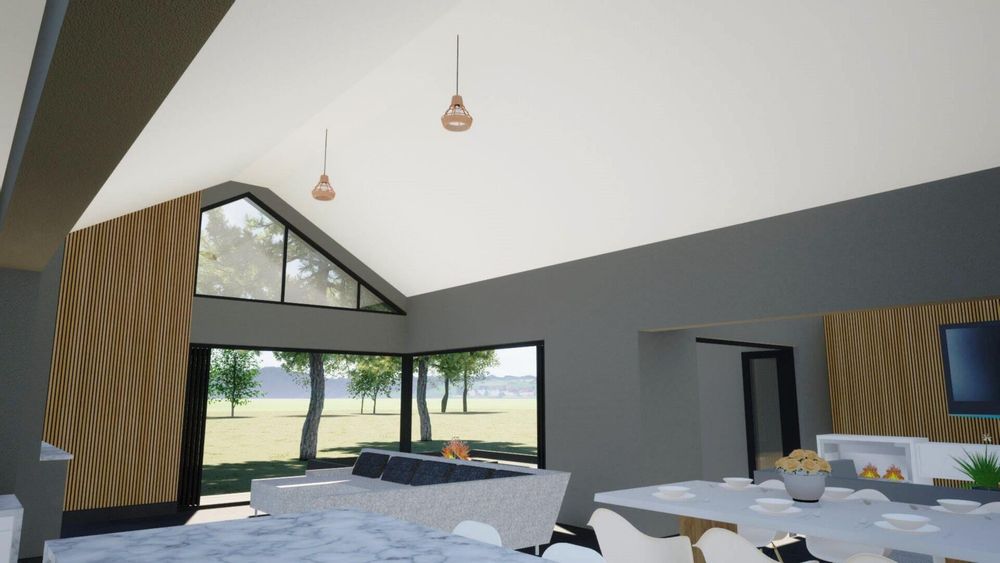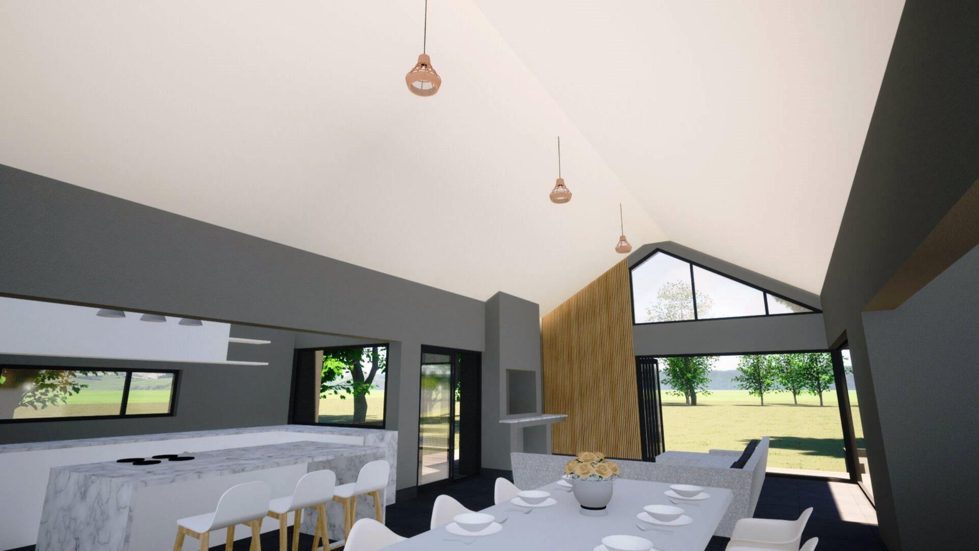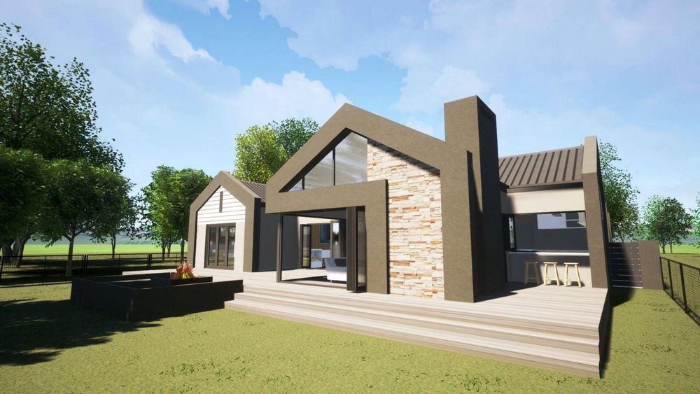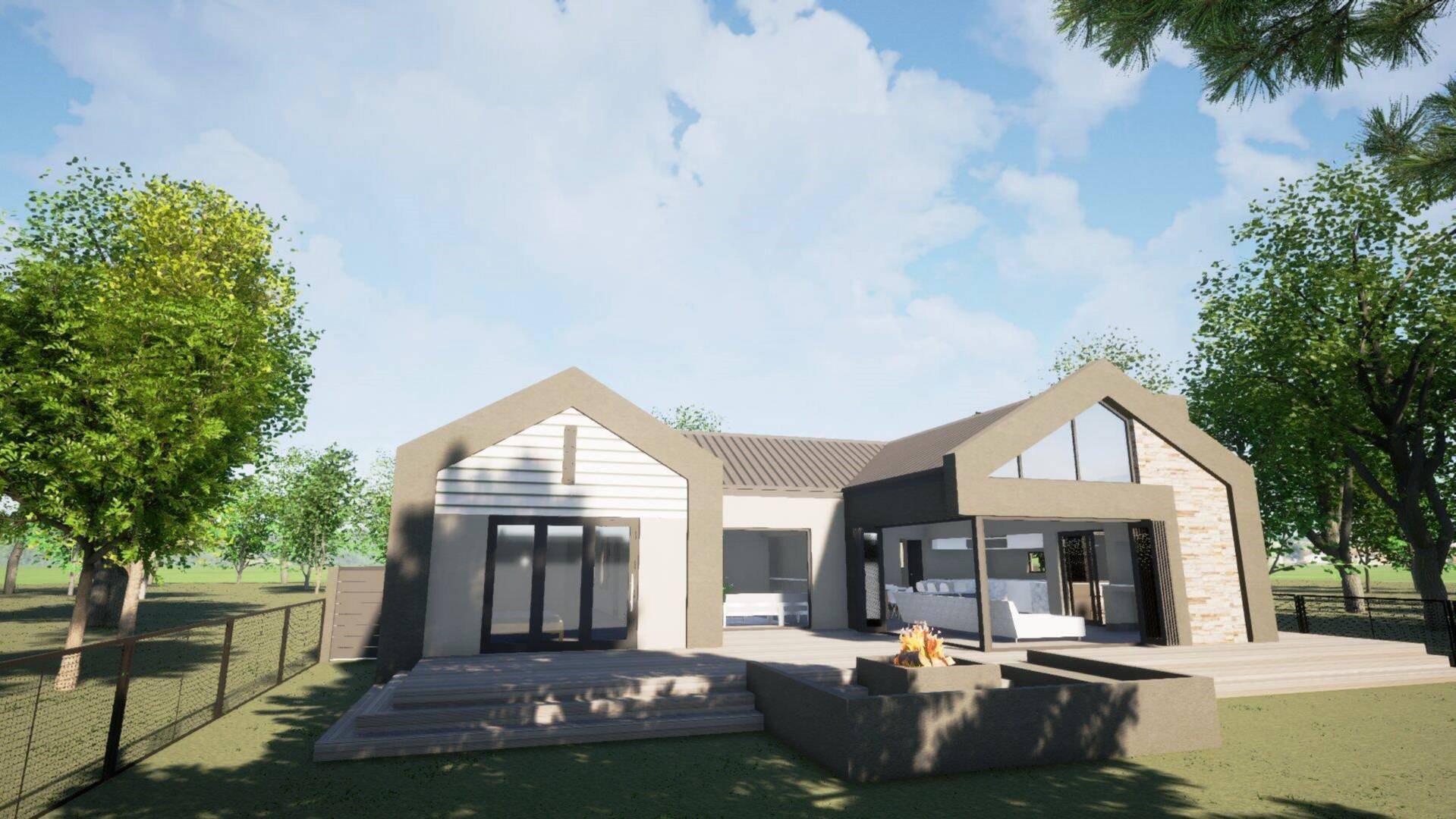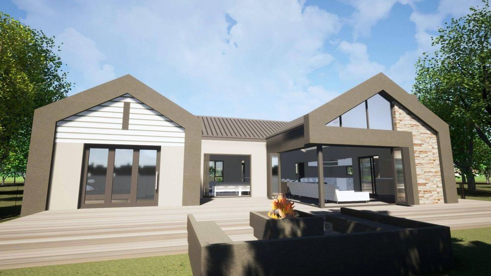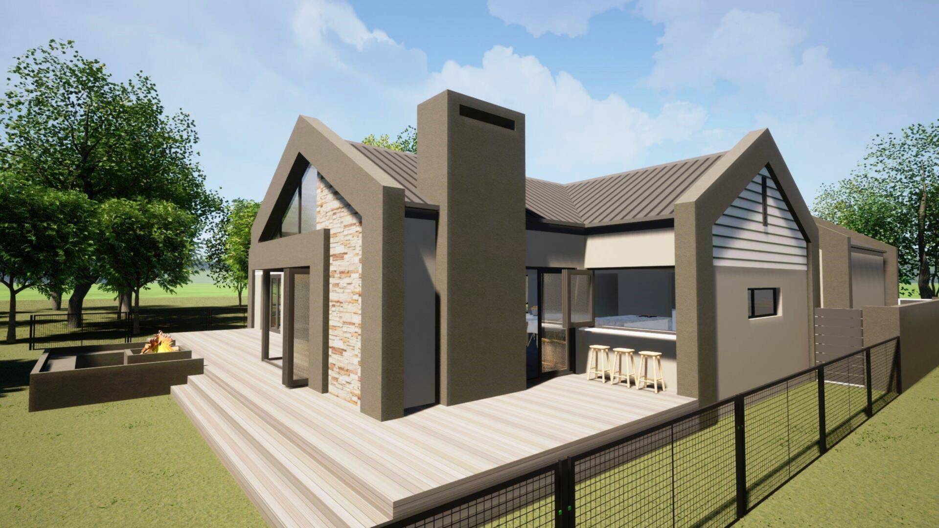 From the moment you arrive, an impressive feature wall in the garden sets a striking tone. The double volume entrance has been expertly planned with weather considerations in mind, leading you into a spacious open-plan living area that harmonizes design and functionality. Sunlight floods the living spaces, offering picturesque views at every turn. The kitchen is a culinary delight, featuring a large working island with a hob and seating for casual dining. It seamlessly connects to a separate scullery, maintaining a minimalist aesthetic. The scullery opens to a outdoor area equipped with a storage water tank integrated into the plumbing system. The kitchen/scullery area is equipped for three appliances, ensuring functionality meets style.