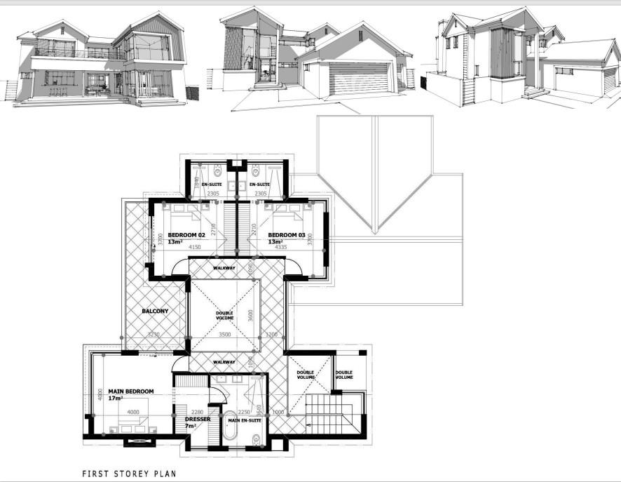 An additional 99m2 upstairs - Ascend the sweeping staircase in the double-volume area to find a luxurious main bedroom featuring a dressing room and full en suite bathroom equipped with double vanities and a walk-in shower. The second and third bedrooms each offer their own en suite facilities. A unique walkway around the double-volume space is a standout feature of this home, encapsulating its luxury and innovative design.