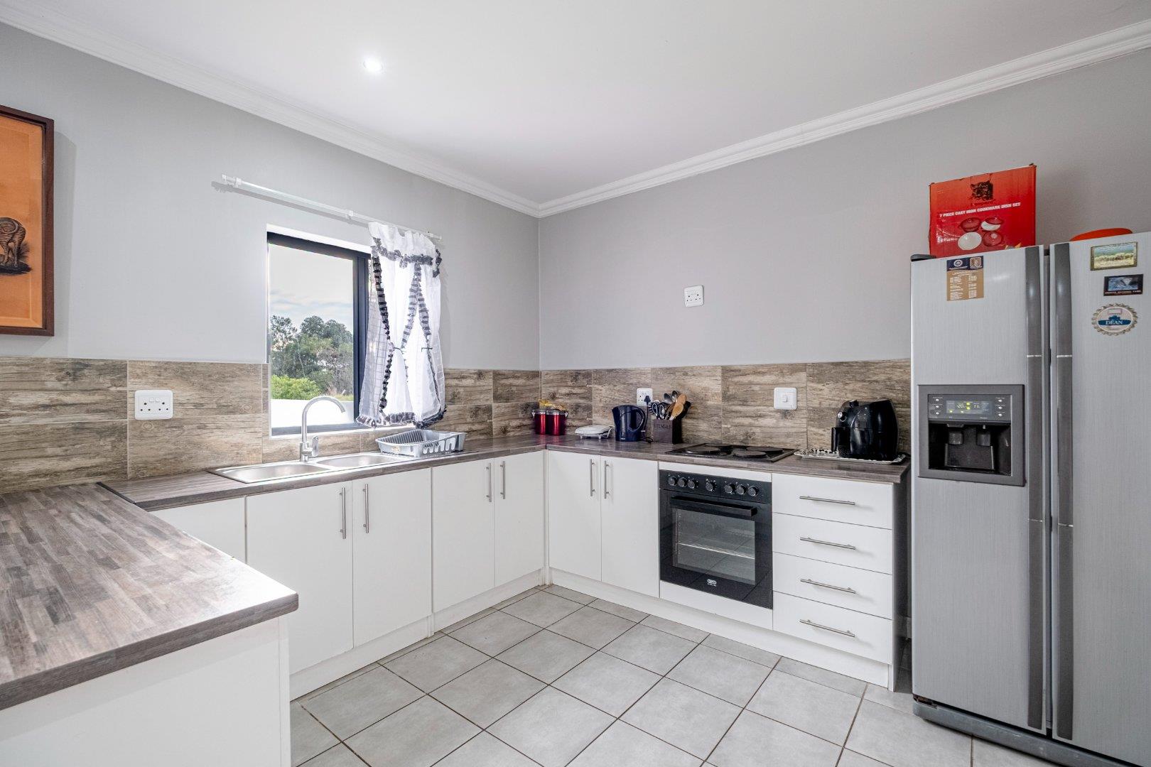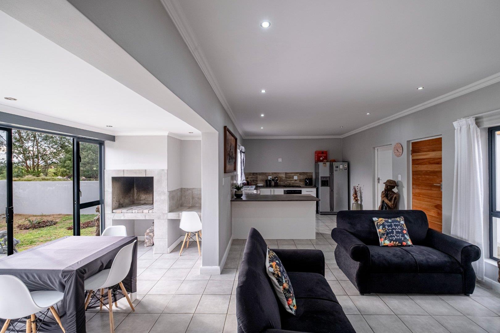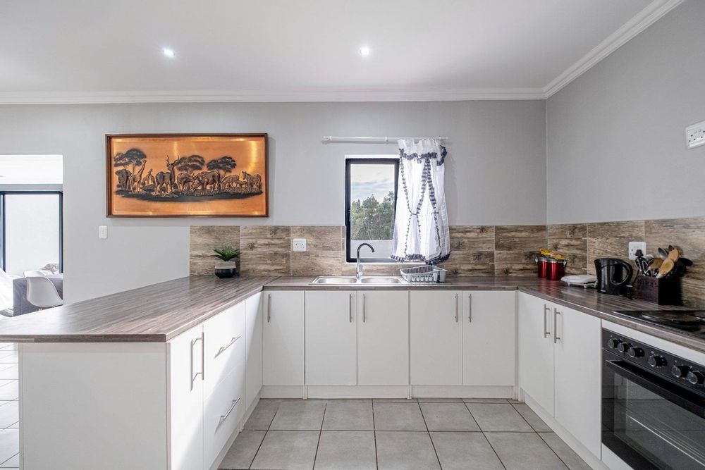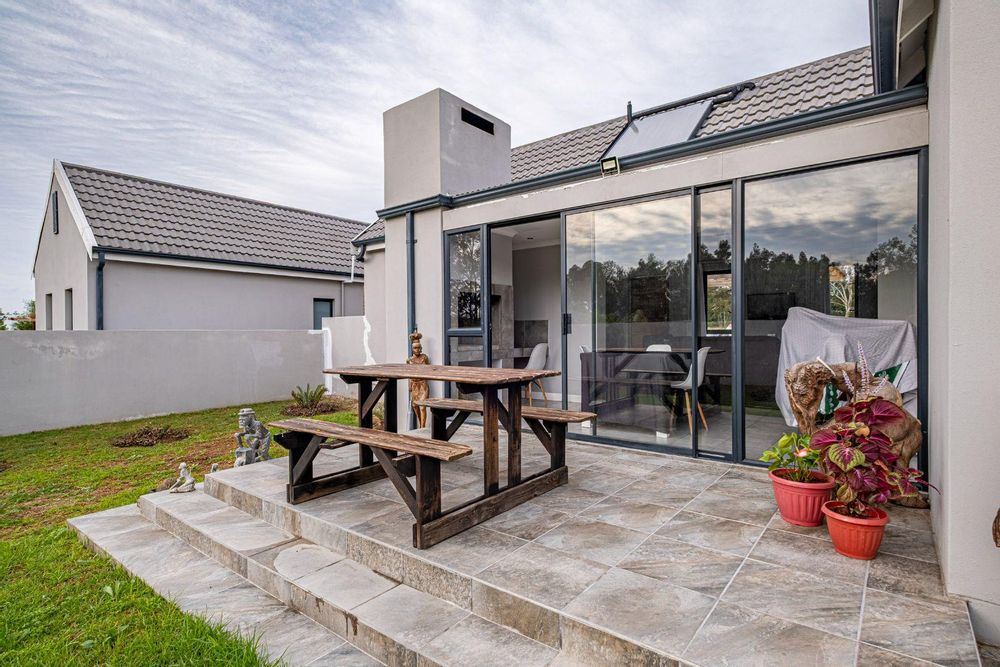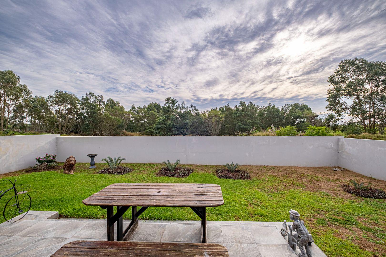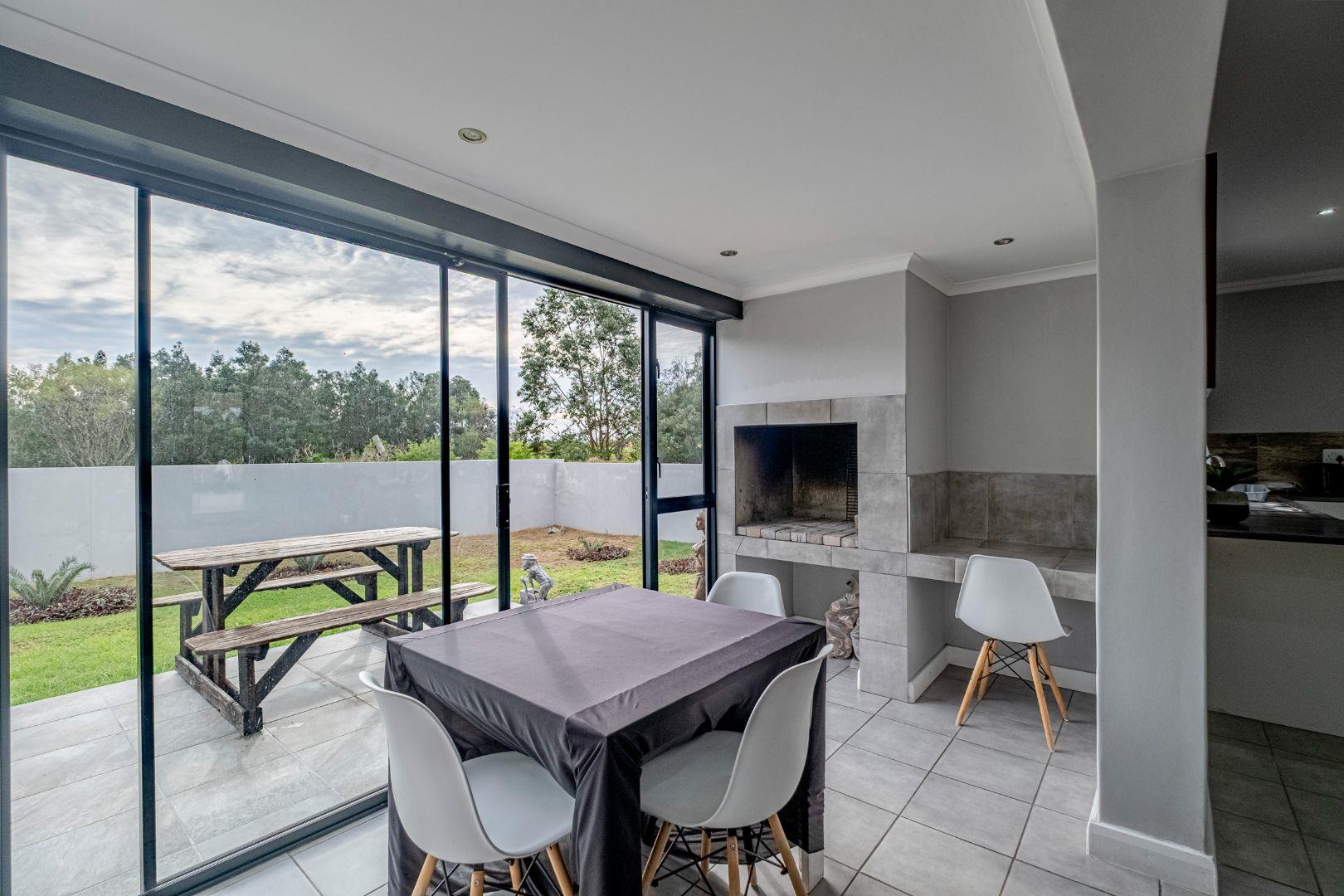 The open-plan lounge boasts picturesque garden views and seamlessly connects to an enclosed patio through sliding doors, leading to a raised tiled patio area. This enclosed space serves as an entertainment haven with a built-in braai and convenient working area. Enjoy uninterrupted views of the natural vegetation from the fully walled, low-maintenance back garden.