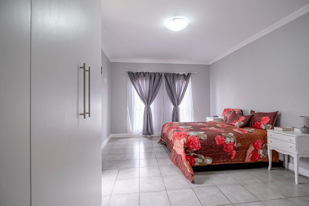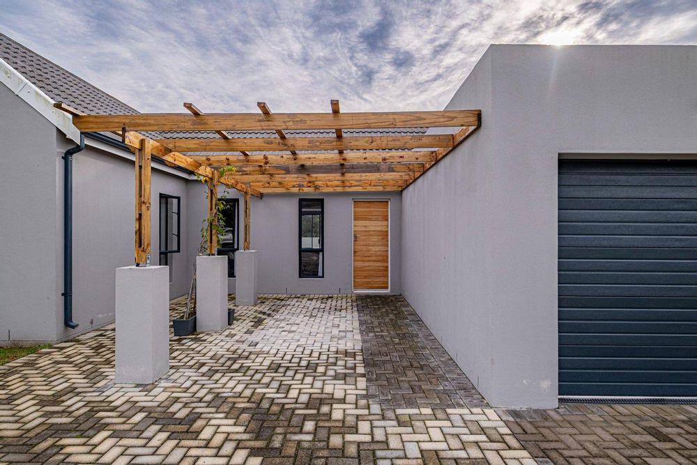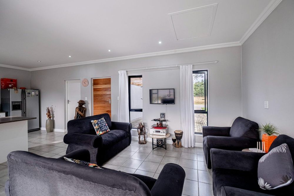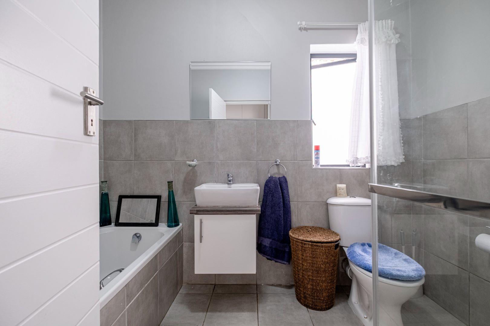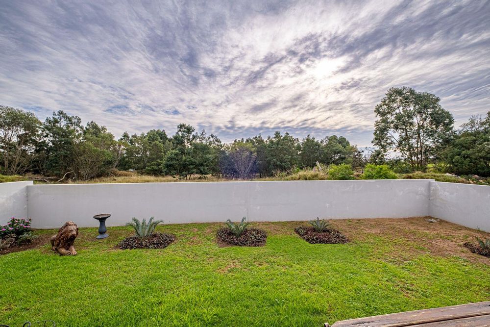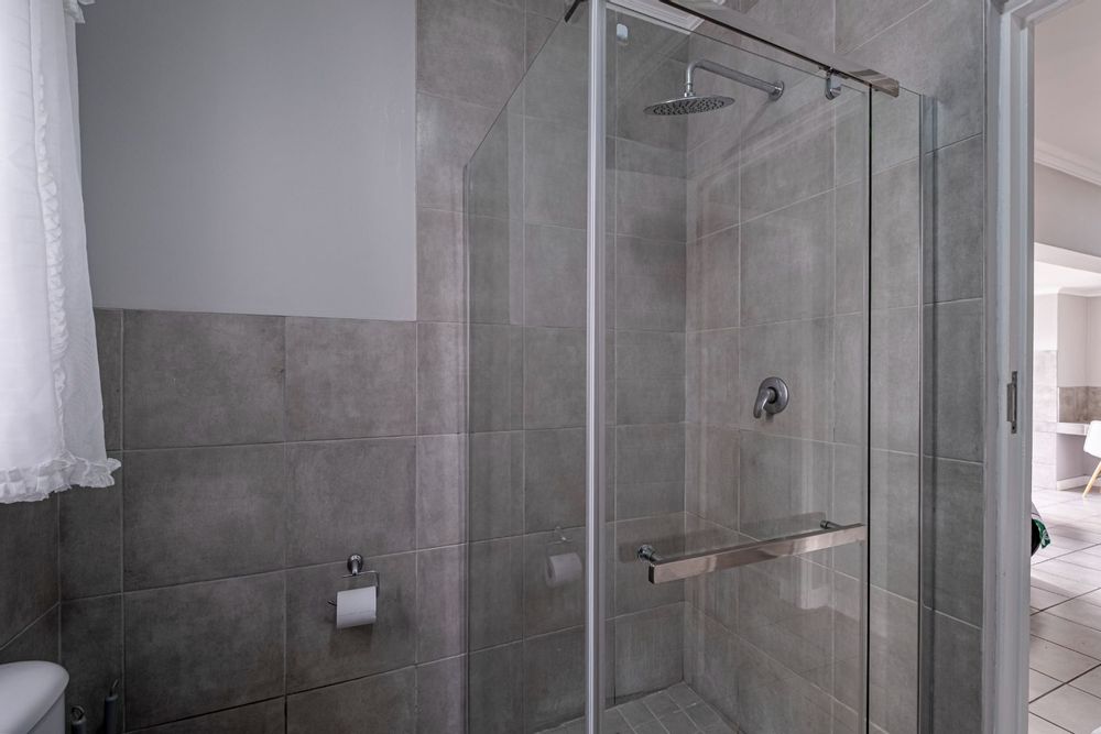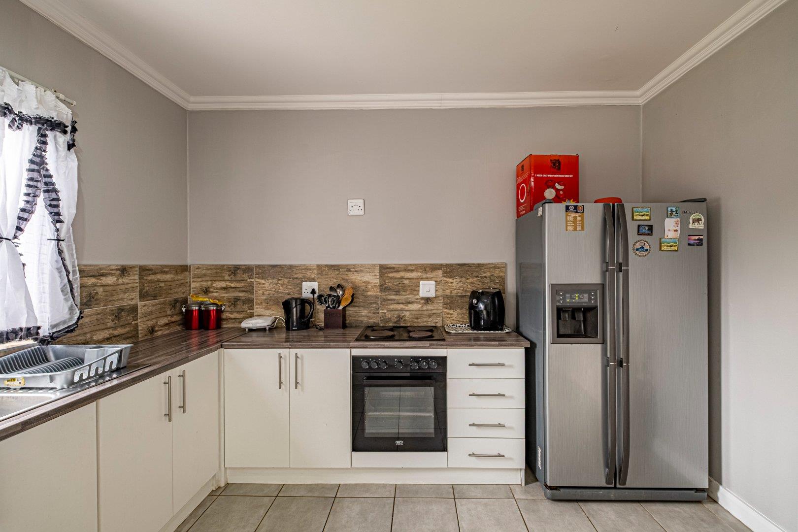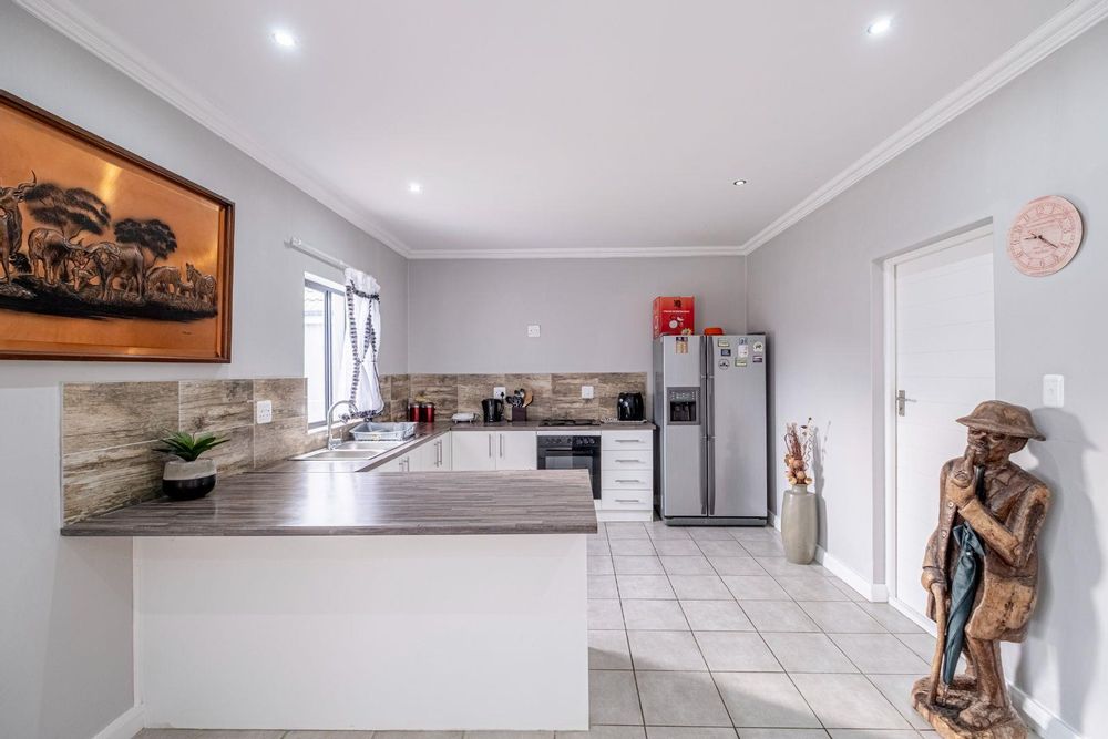 The open-plan lounge boasts picturesque garden views and seamlessly connects to an enclosed patio through sliding doors, leading to a raised tiled patio area. This enclosed space serves as an entertainment haven with a built-in braai and convenient working area. Enjoy uninterrupted views of the natural vegetation from the fully walled, low-maintenance back garden.