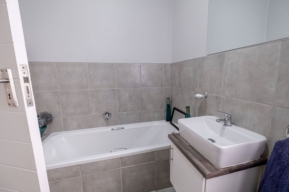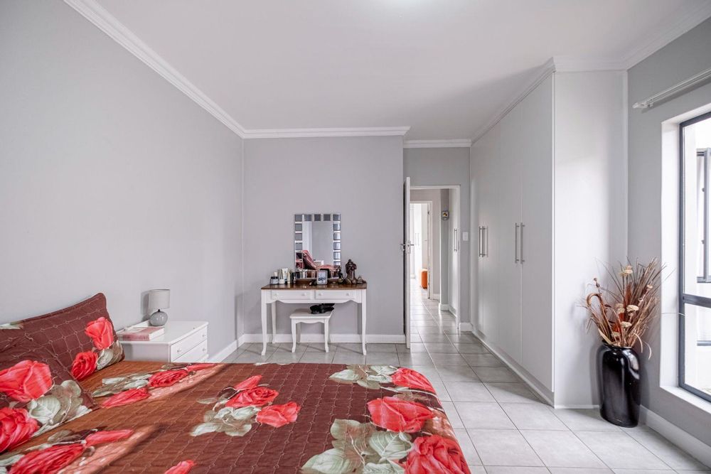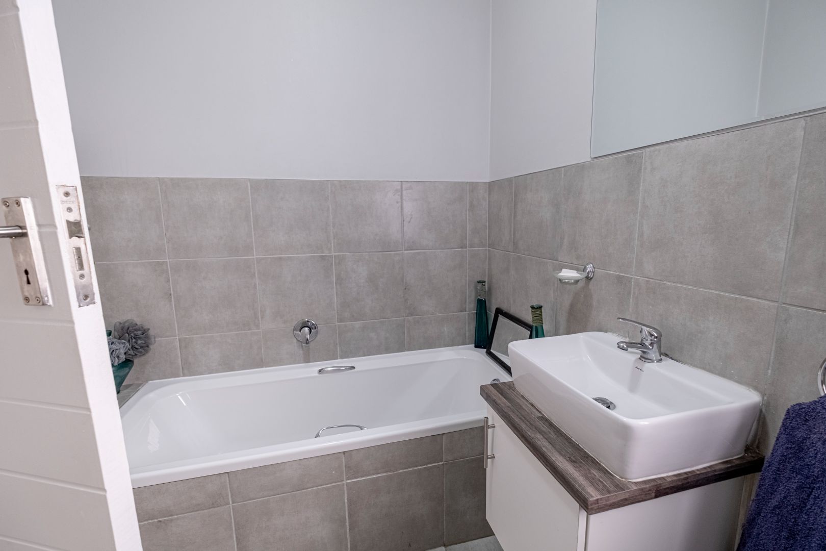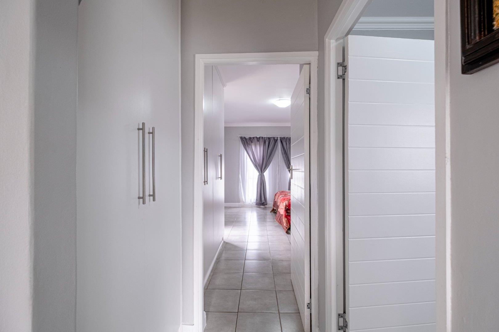 A passageway, equipped with linen cupboards for extra storage, distinctively separates the living area from the bedrooms. The main bedroom is exceptionally spacious with built-in cupboards, while the second bedroom is large enough to serve as a main bedroom and offers views of the back garden.