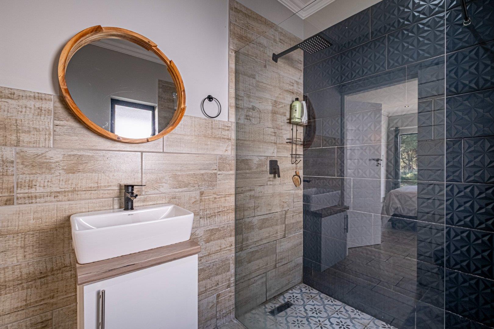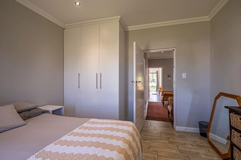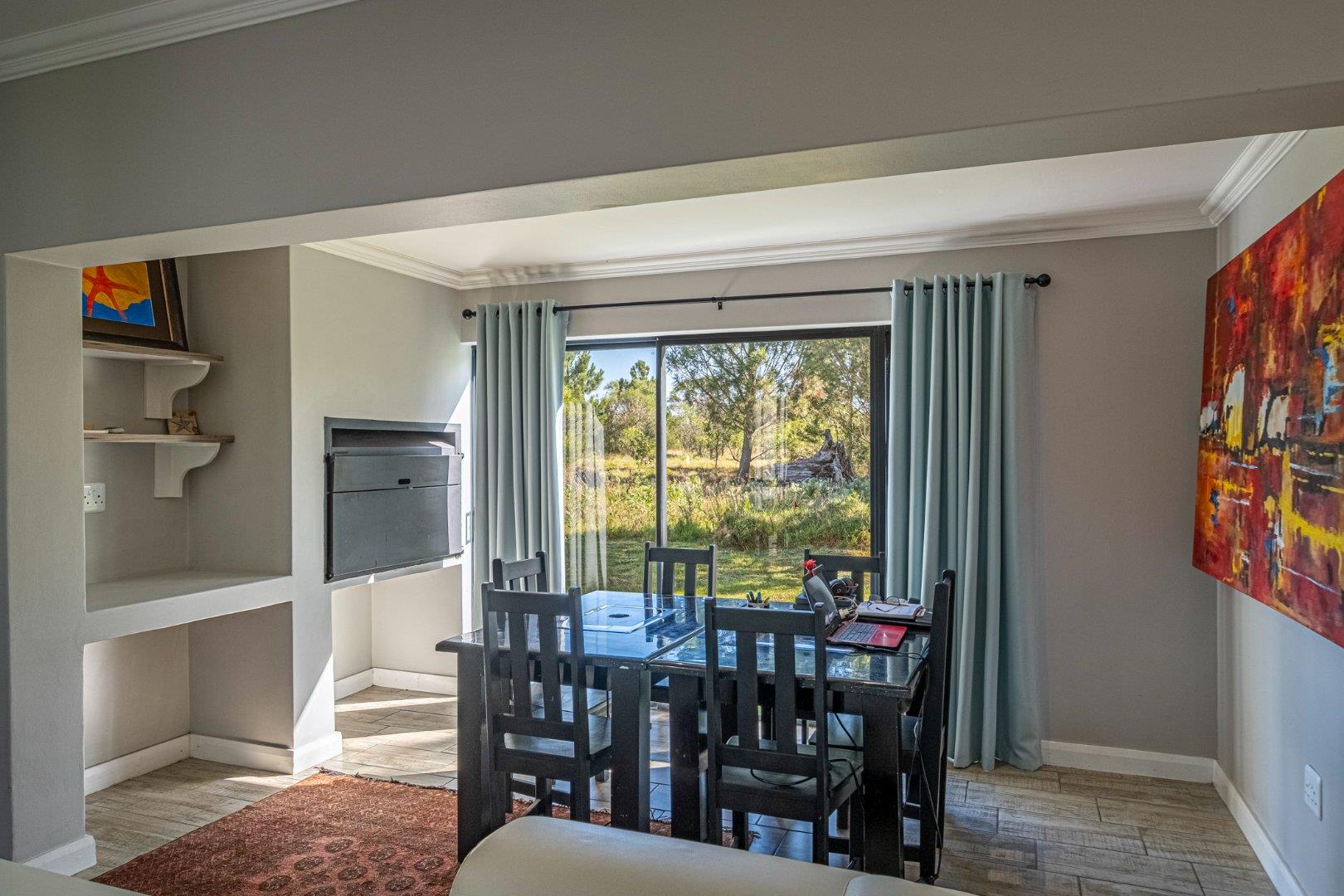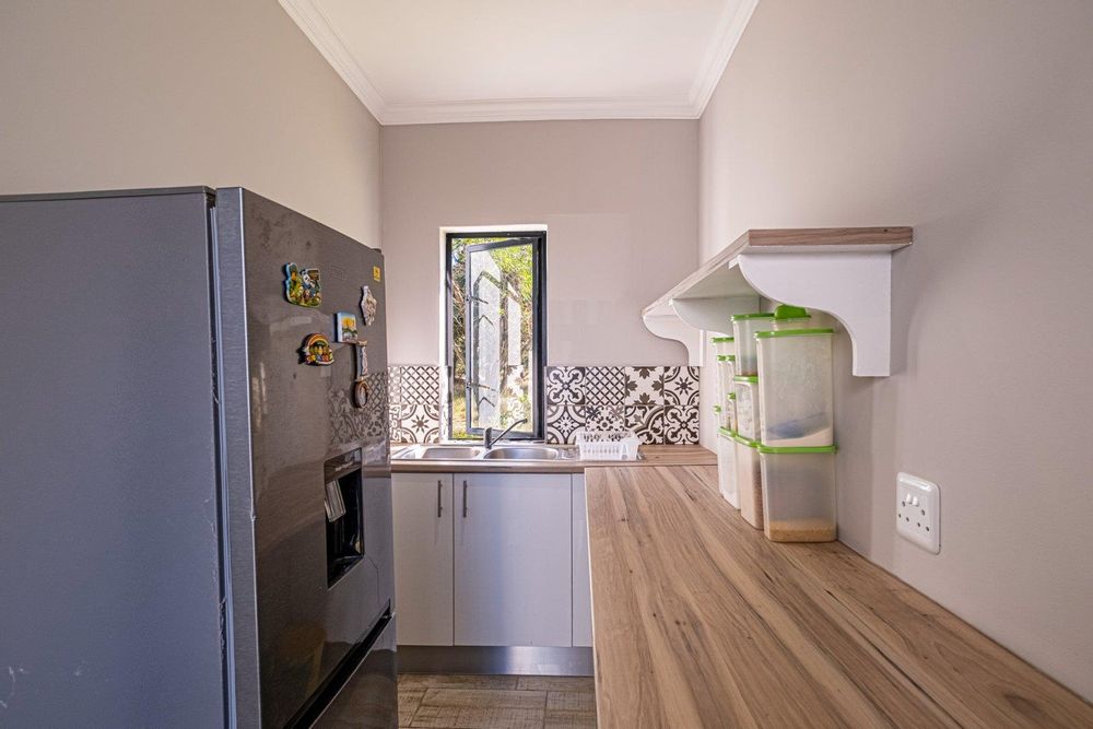 The spacious lounge flows into an enclosed patio, currently used as a dining area. This space includes a built-in braai, convenient shelving, and a sliding door that opens to the lush natural surroundings. The bedrooms are thoughtfully situated in a private wing, providing a retreat from the main living areas. Both bedrooms feature built-in cupboards, while the main bedroom is en suite with stylish tiles that lend a touch of class to the home. The second bedroom, located on the opposite side, utilizes the main bathroom, which also boasts attractive tiling.