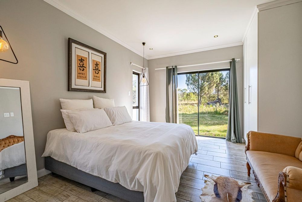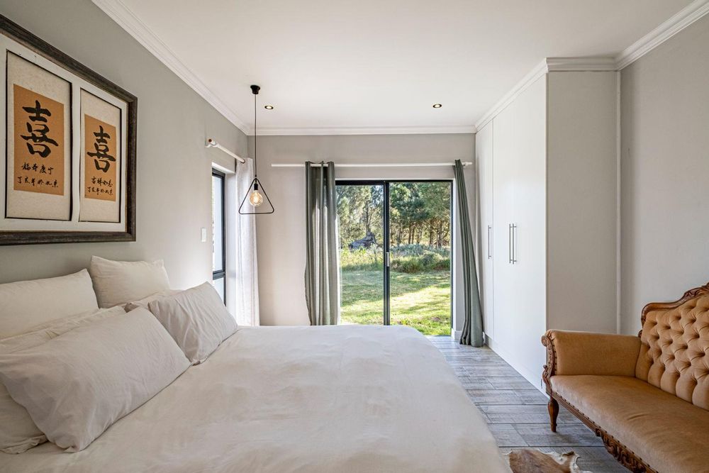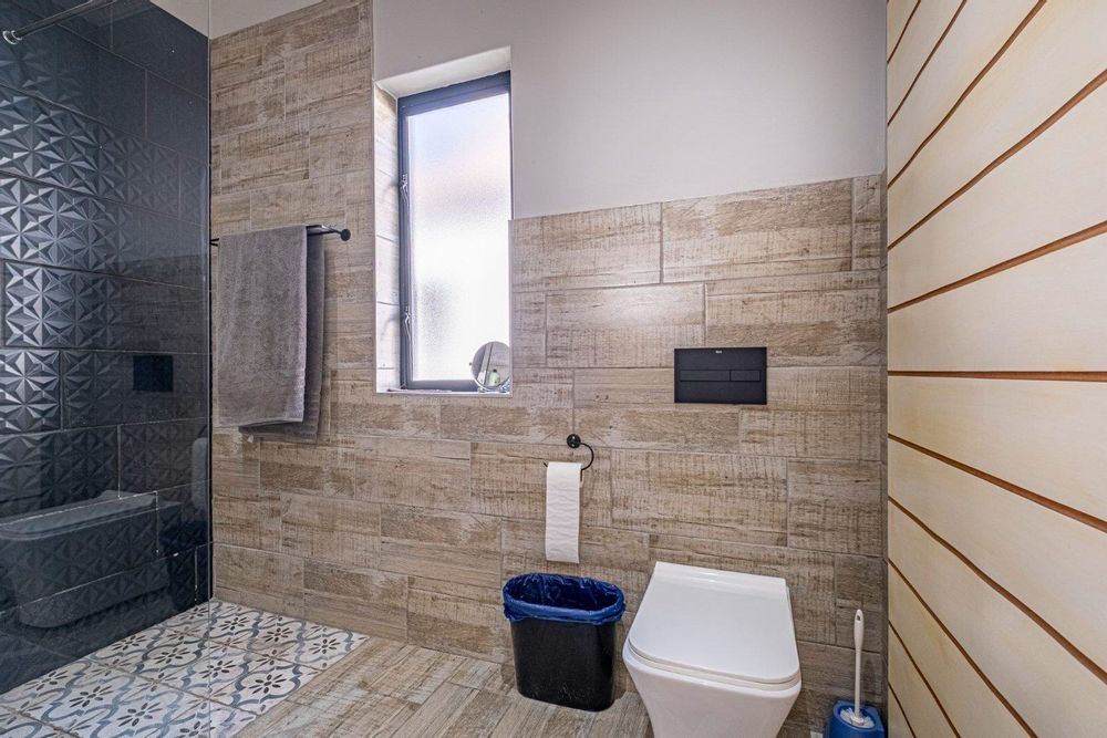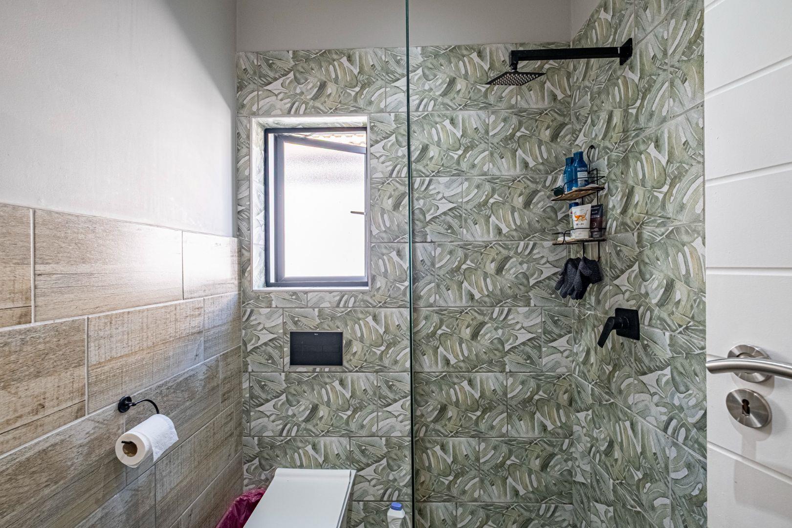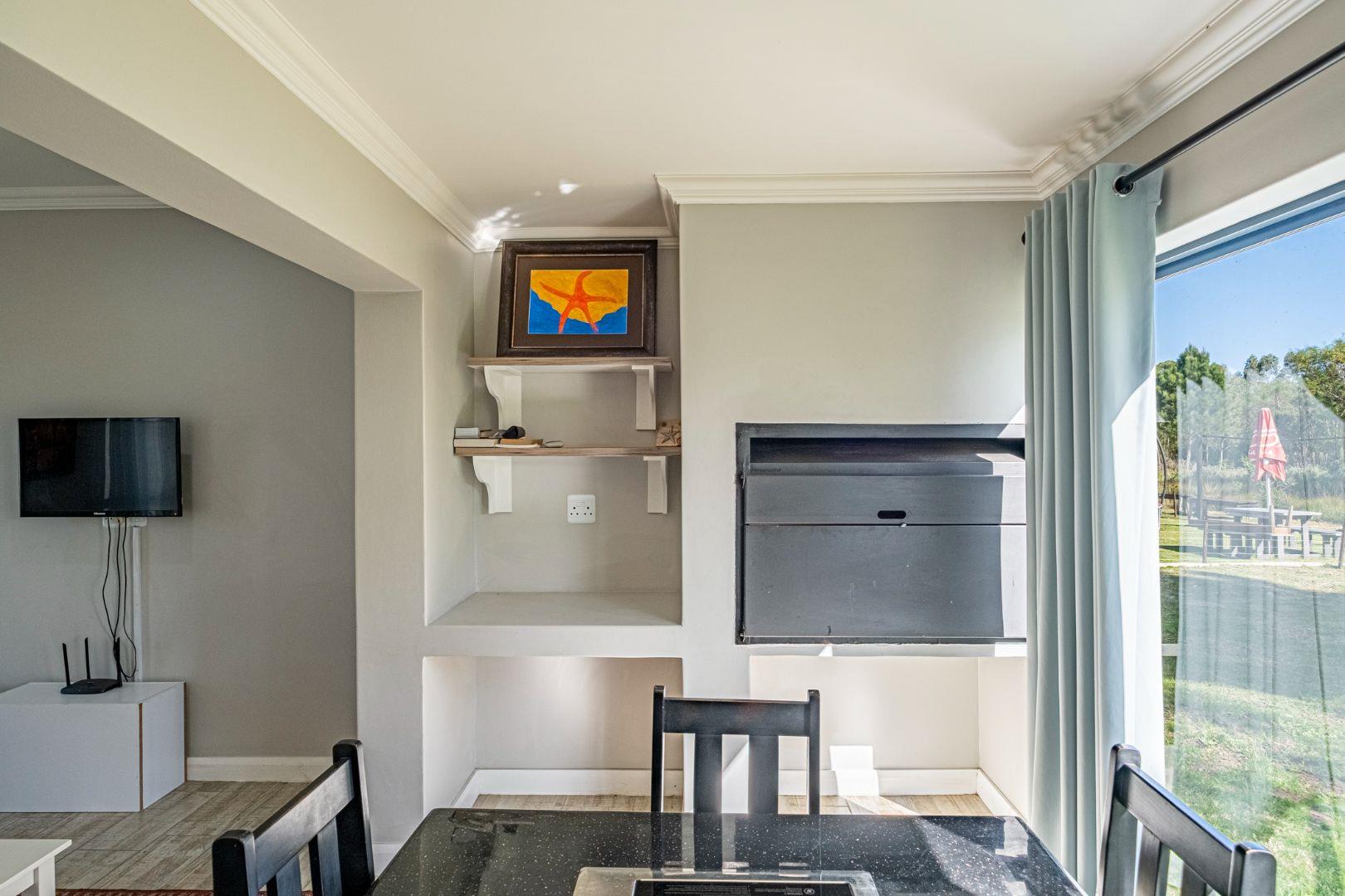The spacious lounge flows into an enclosed patio, currently used as a dining area. This space includes a built-in braai, convenient shelving, and a sliding door that opens to the lush natural surroundings. The bedrooms are thoughtfully situated in a private wing, providing a retreat from the main living areas. Both bedrooms feature built-in cupboards, while the main bedroom is en suite with stylish tiles that lend a touch of class to the home. The second bedroom, located on the opposite side, utilizes the main bathroom, which also boasts attractive tiling.