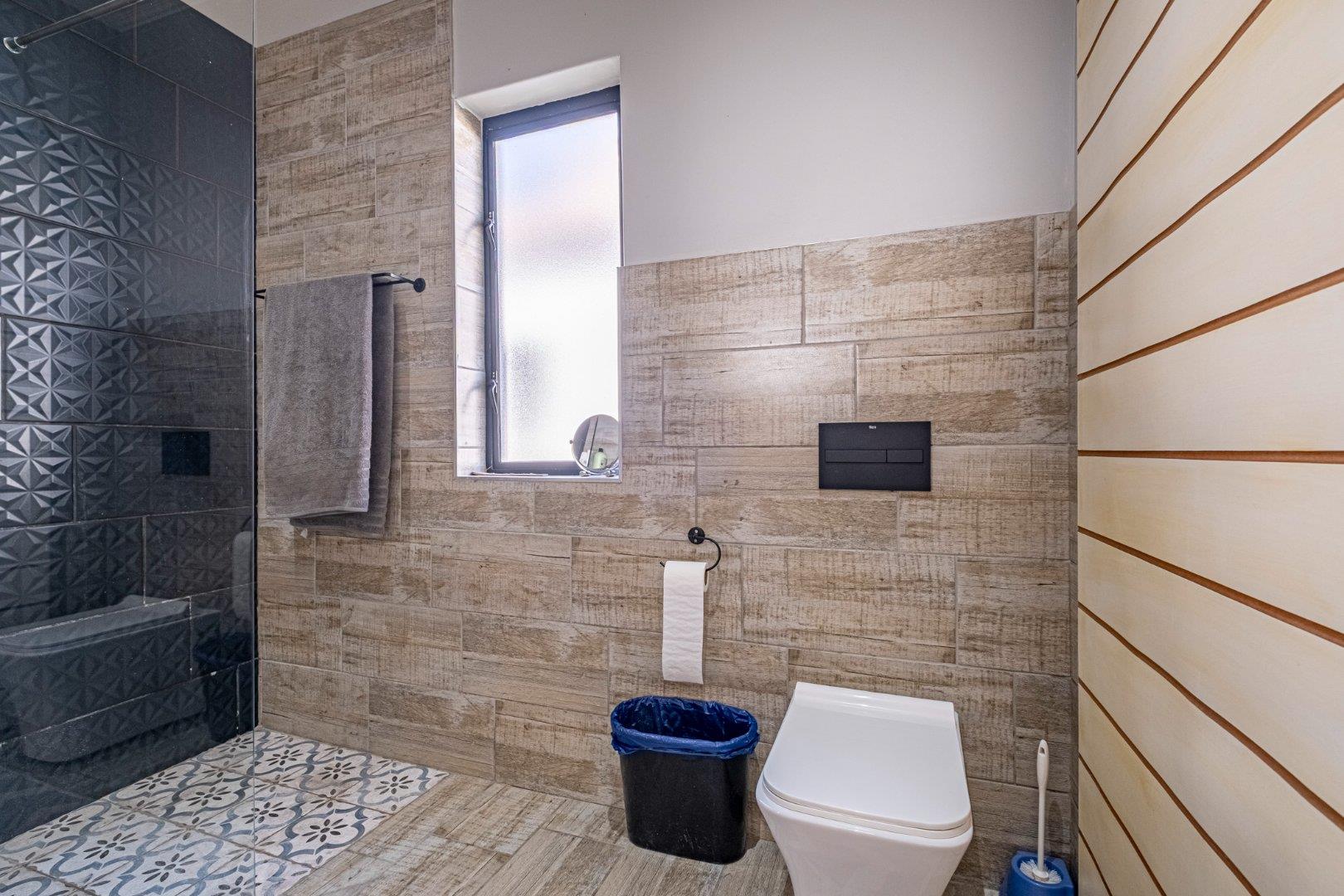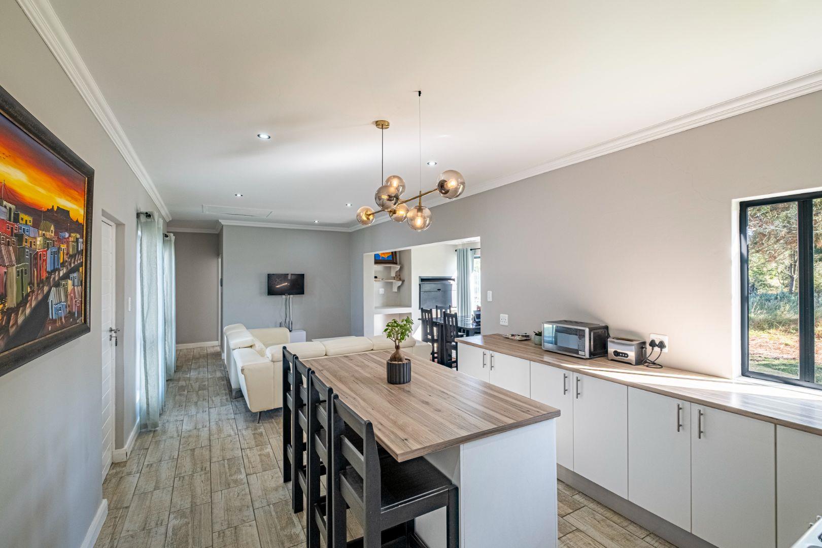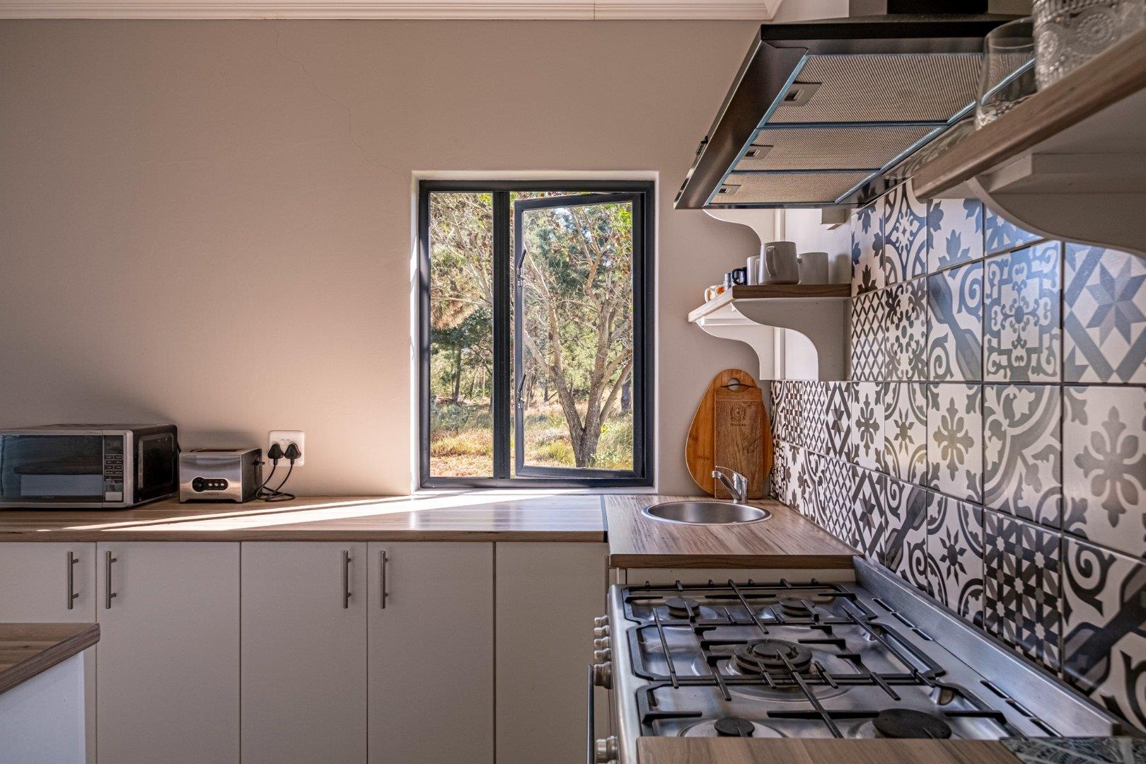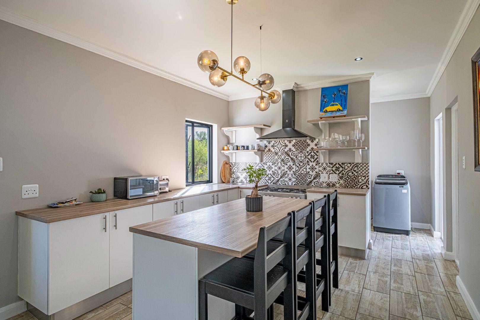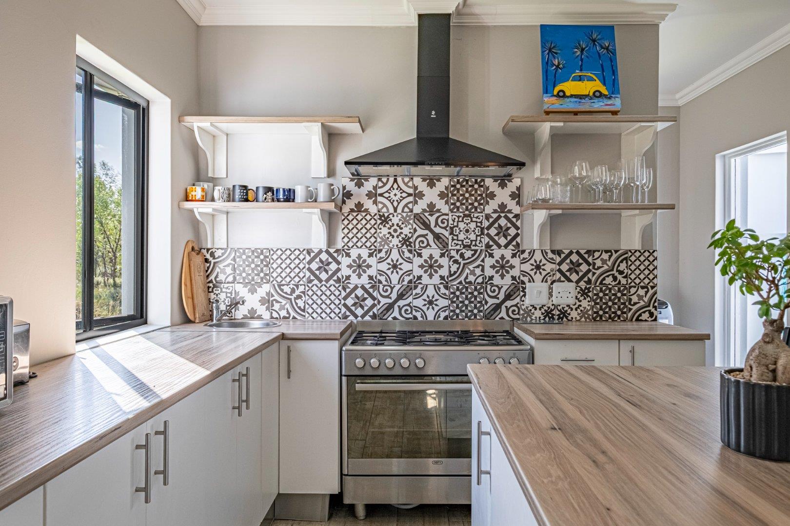 Inside, the home is thoughtfully designed with an array of additional features. The kitchen serves as the heart of the home, showcasing an island and attractive shelving in a space-saving layout. (chairs not included). Delightful decorative tiles adorn the splashback, creating a cohesive decor theme that extends into the separate large scullery. The scullery offers space for two wet appliances and a fridge, ensuring practicality meets style. Culinary enthusiasts will appreciate the free-standing 5-burner gas stove with an electric oven and an elegant overhead extractor fan. This kitchen effortlessly transforms into an inviting entertainment area.